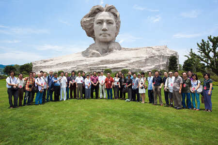 部分与会代表在橘子洲青年毛泽东雕像前合影