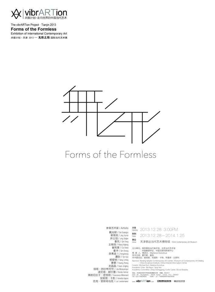 共振计划•天津2013——“无形之形”国际当代艺术展(The vibrARTion Project: “Forms of the Formless” Exhibition of International Contemporary Art Tianjin 2013)邀请美国著名艺术史学者玛琳娜•唐纳休教授(Marlena Donohue)参与策划,是2012中德文化年期间同名展“无形之形——中国当代艺术展”的延伸与拓展。无论是策展团队构成,还是参展艺术家及作品呈现方式,都体现出两次展览主题的关键词“中国”与“国际”的区别。